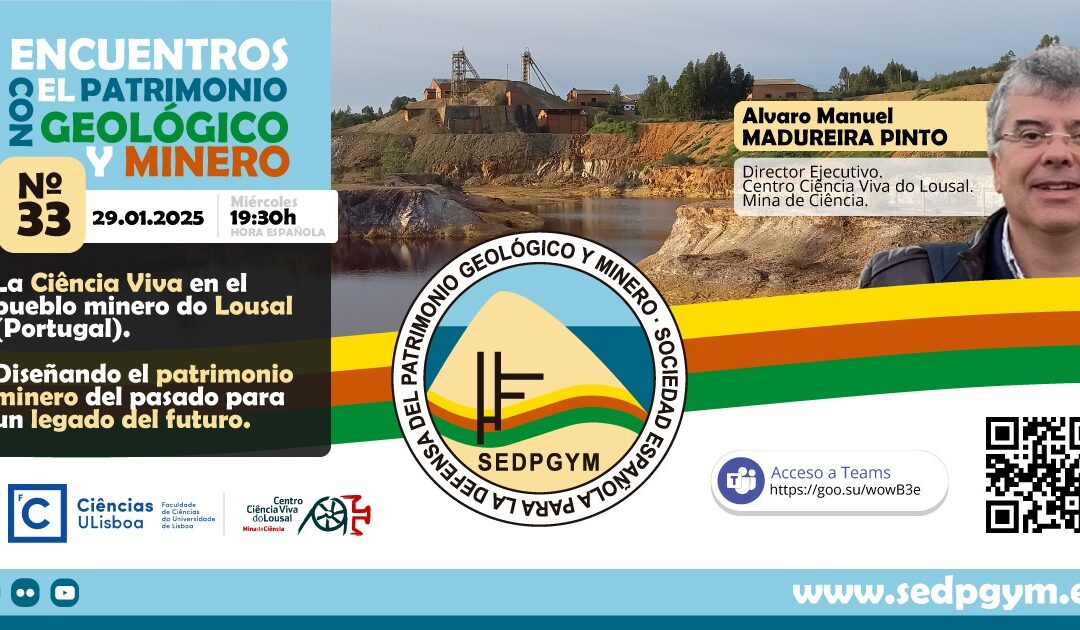 La Sociedad española para la defensa del patrimonio geológico y minero organiza el próximo 29 de enero del 2025 la charla Diseñando el patrimonio minero del pasado para el legado del futuro por parte de Alvaro Manuel Madureira. Será a las 19:30. Se puede seguir por videoconferencia en Teams: https://goo.su/wowB3e