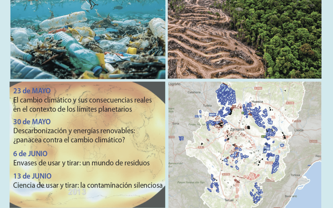 Mesas de debate abierto que se celebrarán el 23 de mayo con el tema «El cambio climático y sus consecuencias reales en el contexto de los límites planetarios.». El 30 de mayo con el tema «Descarbonización y energías renovables: ¿panacea contra el cambio climático?. El 6 de junio «Envases de usar y tirar: un mundo de resíduos». El 13 de junio «Ciencia de usar y tirar: la contaminación silenciosa. Las mesas se celebrarán en el Salón de actos de Geología de la Universidad de Zaragoza. Campus de la plaza San Francisco a las 19:00 horas