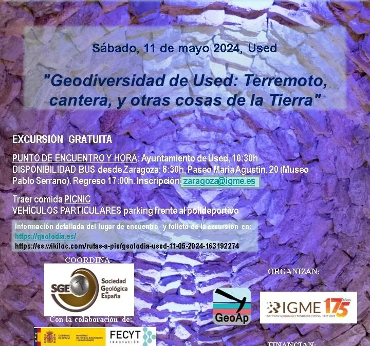 El Geolodía 2024 de Zaragoza se va a celebrar en Used. «Geodiversidad de Used: Terremoto, cantera y oras cosas de la Tierra». El lugar de encuentro será el ayuntamiento de Used a las 10:30