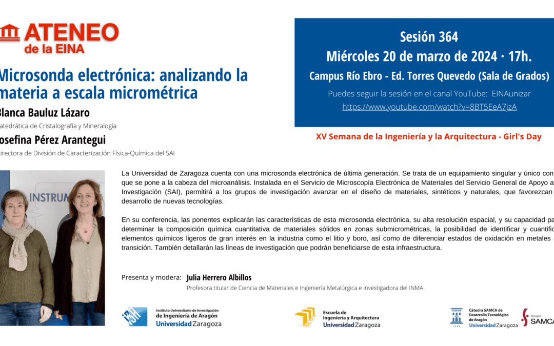 El próximo miércoles 20 de marzo, a las 17 horas, el Ateneo de la EINA estará protagonizado por Blanca Bauluz Lázaro (catedrática de Cristalografía y Mineralogía) y Josefina Pérez Arantegui (directora de División de Caracterización Físico-Química del SAI).