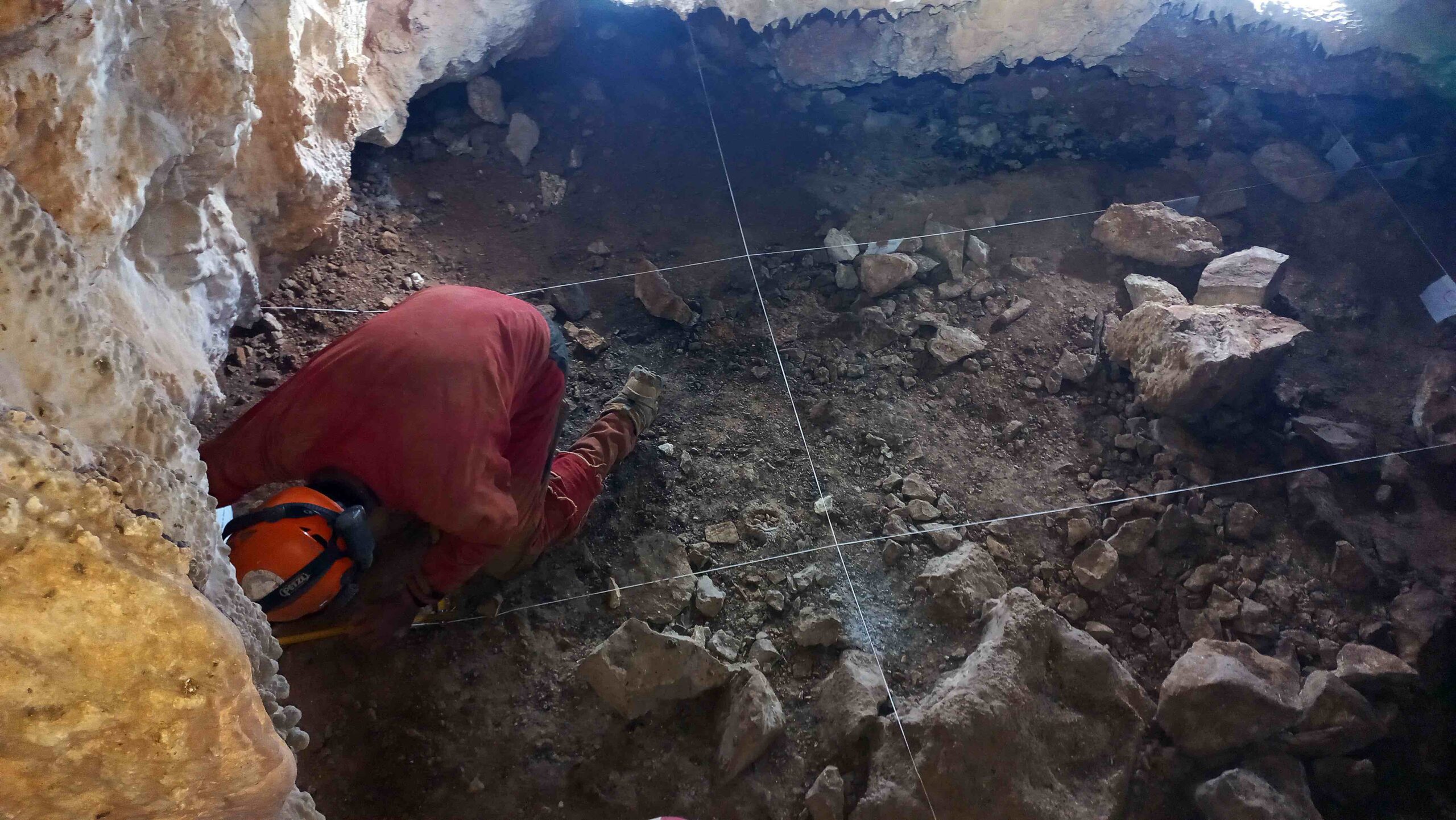 Cueva del Acederal. Trabajos de excavación en la sala Origen de la Galería de los Linces (Autoría: equipo de trabajo de la Cueva del Acederal).